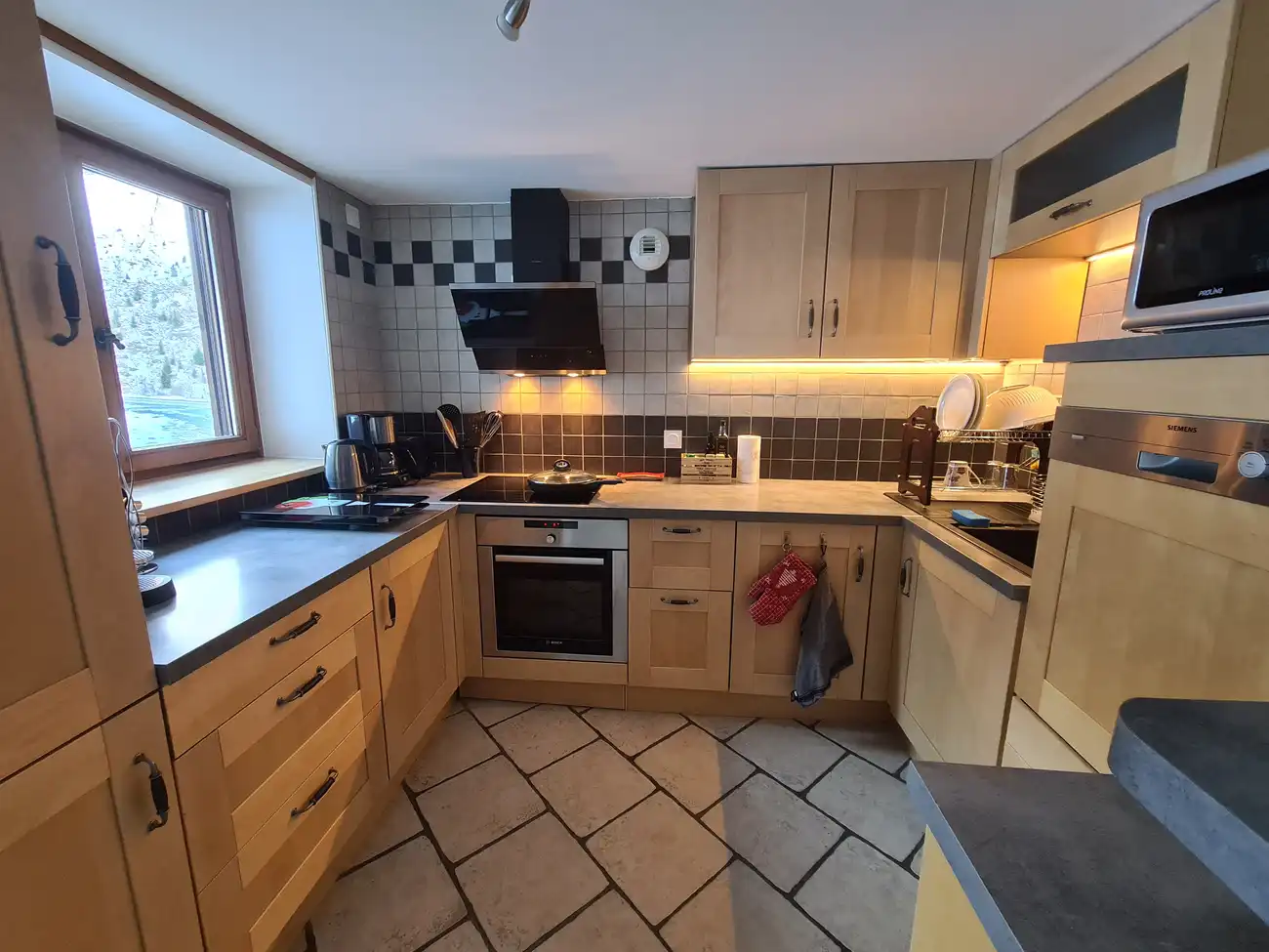 - une cuisine entièrement équipée : Four électrique, table de cuisson, micro-onde, cafetière, bouilloire